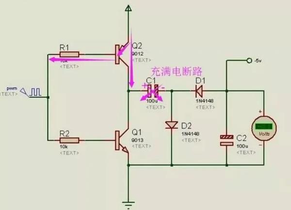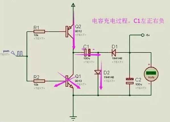 當PWM為低電平時,Q2關(guān)閉,Q1打開,C1開始放電,放電回路是C1-C2-D1,這實際上也是對C2進行充電的過程。C2充好電后,下正上負,如果VCC的電勢為5點幾伏,就可以輸出-5V的電壓了。