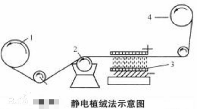 根據絨毛飛揚方向的不同,植絨加工可分為下降法、上升法、橫向飛躍法和向上向下飛躍法。國內植絨加工設備中80%以上采用下降法,故以下降法為例說明其工作原理。 它的上極板是一塊板型金屬網框,下極板是一塊金屬平板托架,上面鋪有網印有膠粘劑的待植絨基布,上、下兩塊極板分別用導線連接在高壓靜電發生器上的正、負輸出端。料斗中的絨毛,由于供毛軸的旋轉,落到金屬網負極上。因絨毛在降落過程中與負極接觸而帶電,導致部分地按電場方向排列。同時絨毛在電場中發生極化,與負極極性相同的電荷集中在遠離負極的一端,而正電荷卻集中在靠近負極的一端。當絨毛與負極接觸 時,由于電極的電導率比絨毛高,會在纖維中產生導電電流,絨毛會產生負靜電荷,使絨毛在電場中具有很大的伸直度和飛翔性,以較高的速度垂直下落到網印有膠粘劑圖案的基布上,形成精美的絨面圖文。在靜電植絨加工中,絨毛除了因接觸而帶電外,又因進入電場受到極化作用而帶電,保證了絨毛向正極板方向運動,促使絨毛在均勻電場中不停地轉動,使得絨毛直立于基布表面而不會平躺在上面。